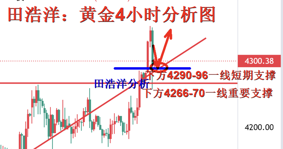 黄金周五过山车模式再次上演,周五下午冲高午夜再进行探底,最低触及4257一线,最高冲击4353一线,最终收盘在4300一线关口,振幅一百多美金,从收盘的走势来看,黄金下周继续以冲高为主,下方我们关注4290-96一线,回踩不破继续做多,毕竟多头趋势依旧存在,无论是技术面还是国际消息面,黄金上涨无疑是正确的方向,操作上我们依旧保持回踩不破做多为主,顺势操作,切勿逆势追单,否则都会在扛单熬夜中度过!如果你目前操作不理想,希望田浩洋能让你的投资少走弯路,欢迎前来沟通交流!