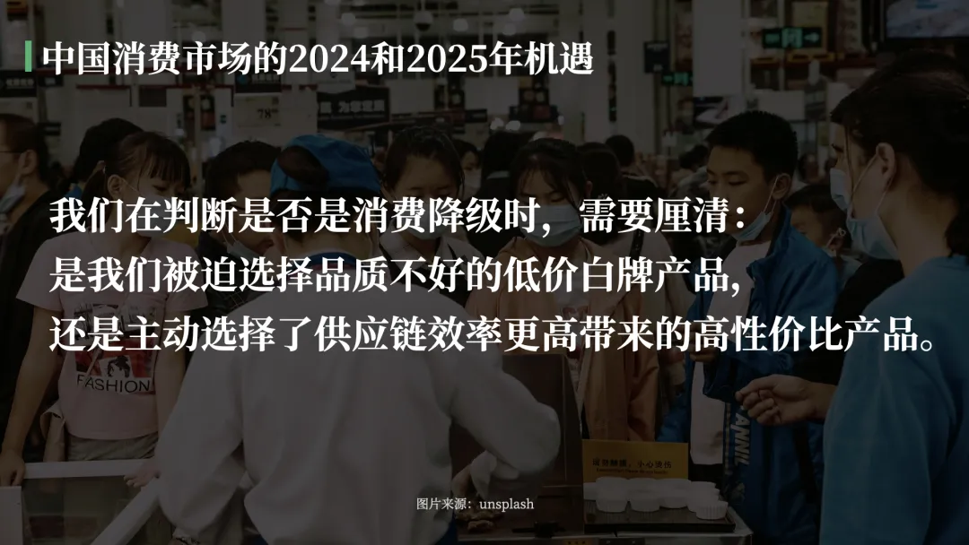 这需要具体而论,我们在判断是否是消费降级时,需要厘清:是我们被迫选择品质不好的低价白牌或无牌产品,还是主动选择了供应链效率更高带来的高性价比产品。
