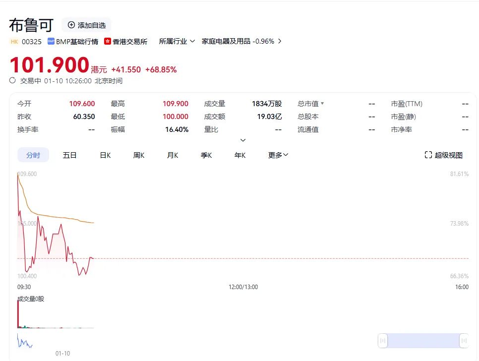 1月10日,布鲁可在港交所成功挂牌上市,发行价为每股60.35港元,开盘飙升每股109.6港元,总市值253.5亿港元(约合238.8亿元)。