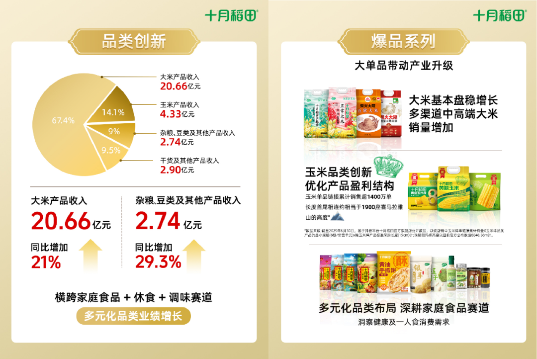细分来看,2025上半年大米产品收入20.66亿元,同比增长21%,仍为最大收入来源;除了聚焦高端大米业绩增长,十月稻田也发挥领先影响力,参与制定五常大米新国标,助推行业高质量发展。