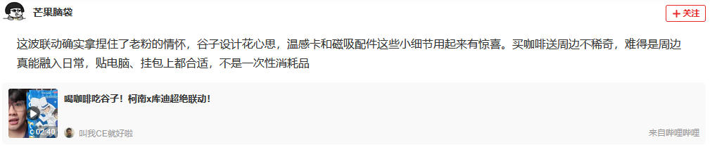 比如,在与柯南的联名活动中,一位粉丝评论道:“这波联动确实拿捏住了老粉的情怀,谷子设计花心思,温感卡和磁吸配件这些小细节用起来有惊喜。买咖啡送周边不稀奇,难得是周边真能融入日常,贴电脑、挂包上都合适,不是一次性消耗品。”