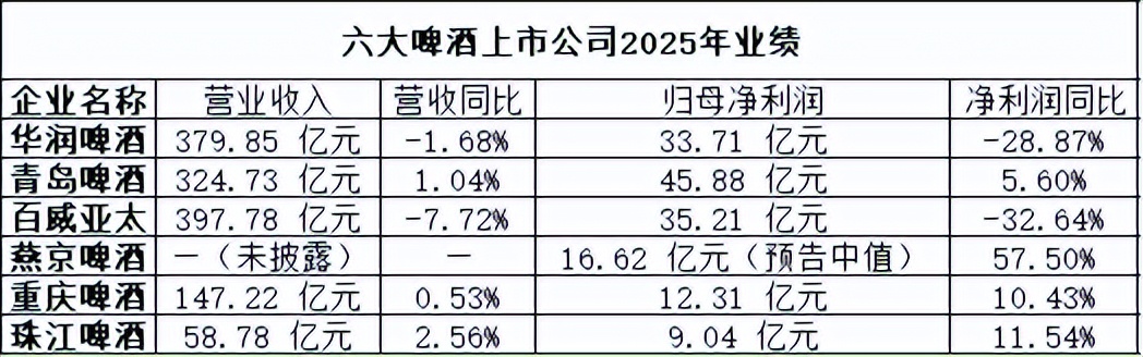 从2025年年报及业绩预告披露的数据来看,六家上市啤酒公司的表现呈现出清晰的梯度与分野。