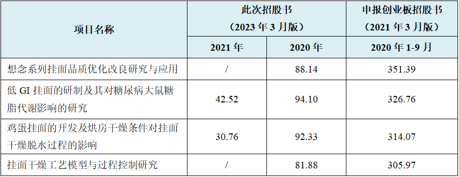 被打脸的是,同样是2019年,想念食品此次提交主板的招股书中披露的研发费用为996.25万元,比之前减少了1,300余万元!对比研发费用明细,主要来自直接投入金额的大幅减少;对比研发项目明细,“想念系列挂面品质优化改良研究与应用”项目减少568.85万元、“不同品种(子品牌)挂面内在品质优化研究与应用”项目减少518.23万元。我们推测想念食品创业板撤单的原因之一可能就是虚增了研发费用,而在研发费上经不起深交所的推敲和问询。