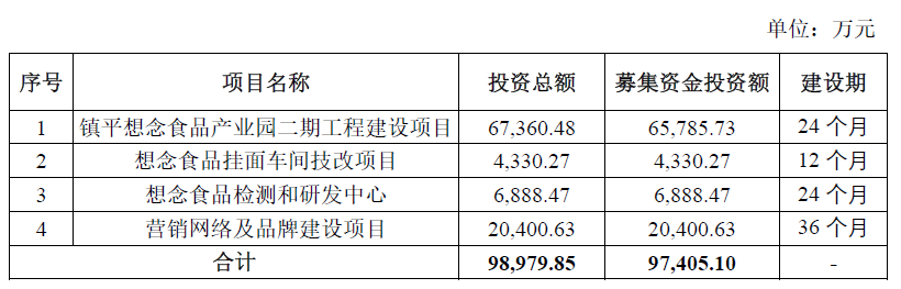 招股书显示,“想念食品挂面车间技改项目”即对部分挂面车间房屋修缮、更新部分包装及烘干设备,以及对部分挂面生产线重新布局。募投金额的80%以上用于设备购置费及安装工程费。