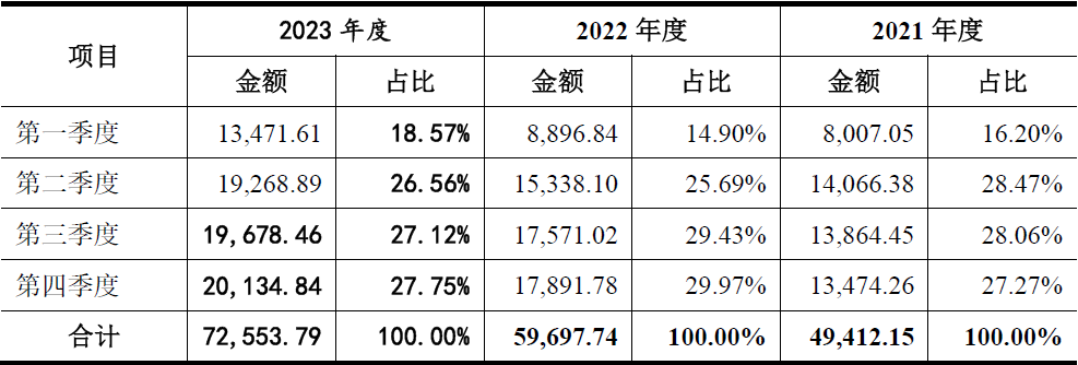 发行人披露的主营业务收入按季节构成情况,如下表所示: