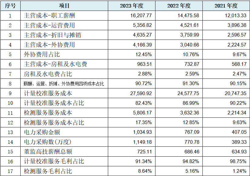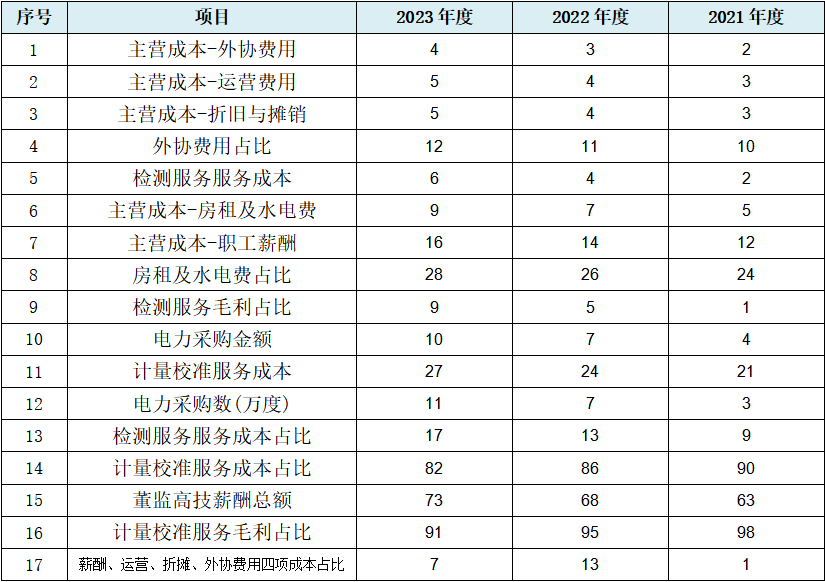 虽然上表中综合毛利率数据并没有直接表现出规律性变化,但招股书中披露的核心业务计量校准服务毛利率分别为55.70%、54.81%、56.40%,取大数即为55、54、56,明显表现以自然数为变化数,但不依次出现的隐蔽规律。发行人盈利数据异常尤其还表现在大量规律性变化的成本、盈利类数据以及一高两低的“三最”期间费用率方面。