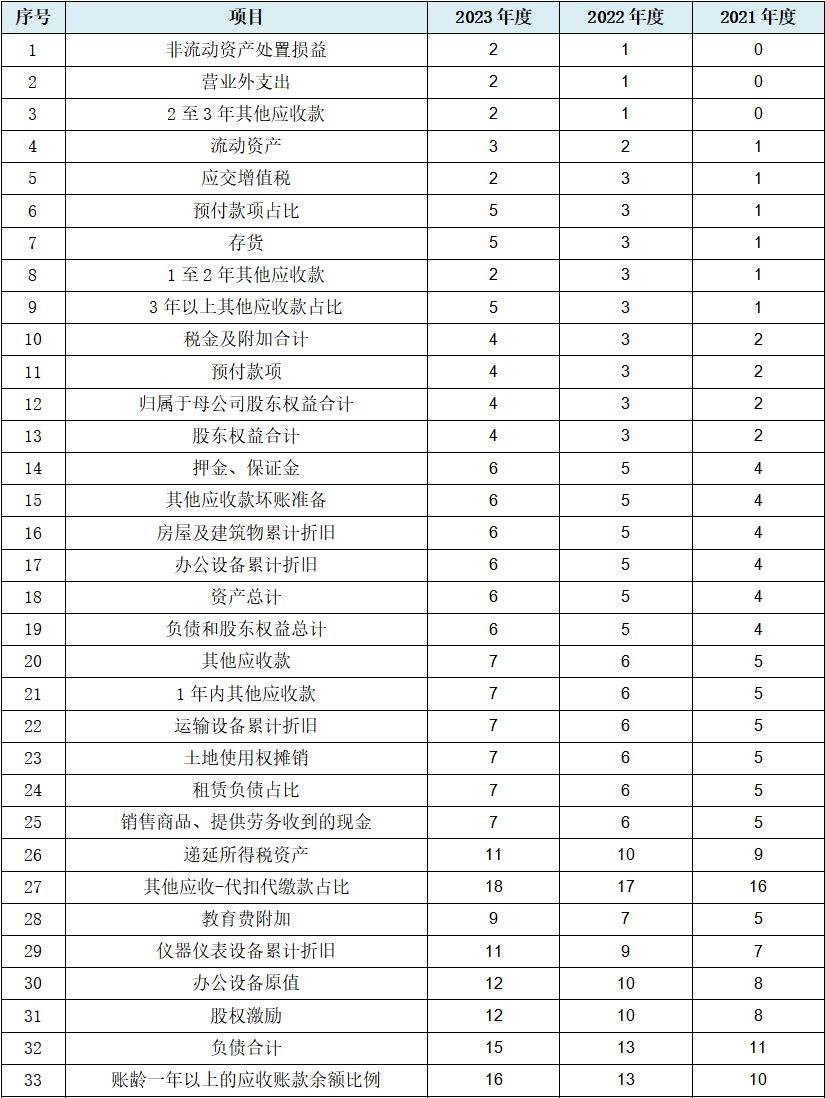 从上表可见,发行人其他财务数据规律变化共计66项,其中涉及损益类6项,资产负债类52项,现金流量类4项,指标类4项,三张会计报表全部涉及。从该统计结果我们不难发现,发行人涉资产负债类最多,说明发行人资产负债表的真实性和收入、成本数据一样,也可能不容乐观。