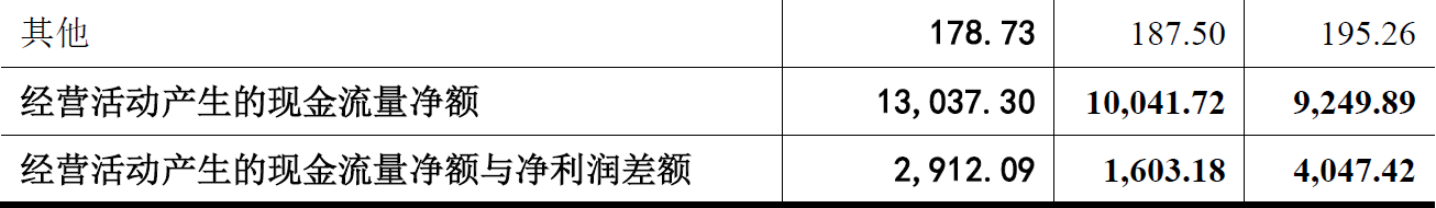 从上表可见,调整项目中首先存在指向不明“其他”类项目,金额分别为195.26万元、187.50万元、178.73万元,每年规律性减少10万元左右。且经营活动产生的现金流量净额与净利润差额分别为:4,047.42万元、1,603.18万元、2,912.09万元,年均2,854.23万元,也即发行人从净利润调节为经营活动现金流量每年存在近3千万元差额而无法编平,此差额还未包括上述“其他”项下的可能差异,发行人财务数据真实性再一次存疑。
