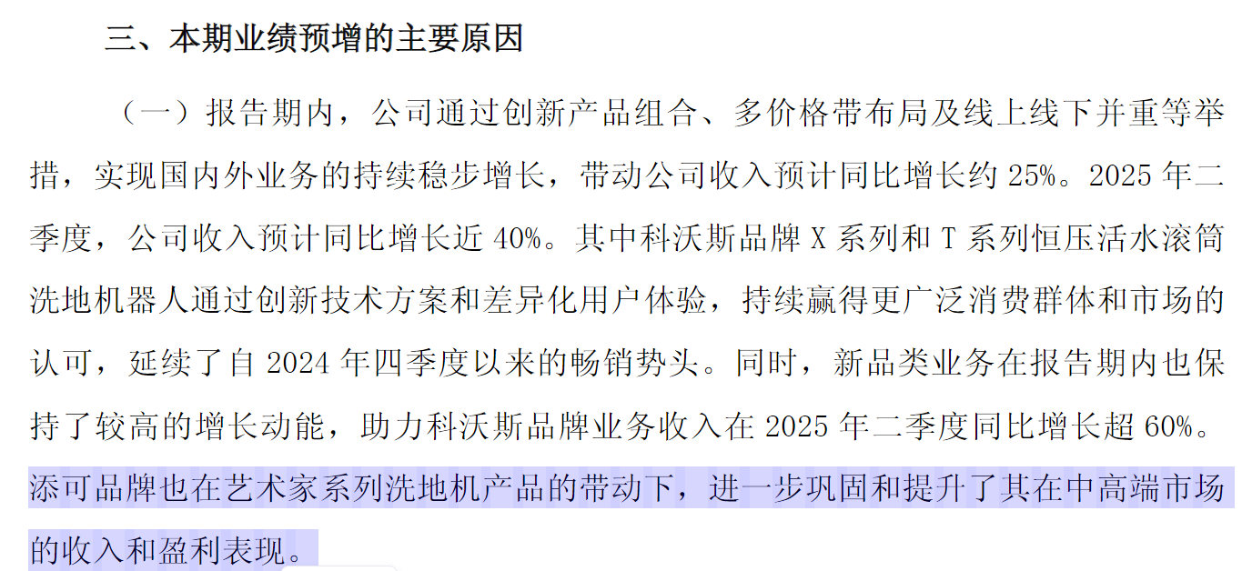 科沃斯在最新业绩预告中披露了驱动上半年业绩增长的三大关键因素。首先是营收规模的扩张,公司预计上半年整体营业收入同比增长25%,其中第二季度科沃斯主品牌收入实现超60%的同比增幅。
