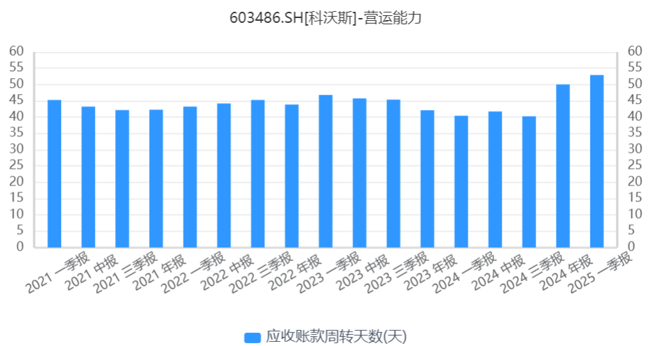 科沃斯的运营效率问题同样不容忽视。2024年,科沃斯在营收仅增长6.7%的情况下,应收账款却激增74.6%,其中第四季度应收账款周转天数突破50天,创近五年新高;2025年第一季度进一步延长至52.9天,远超石头科技在同期21.8天的水平。