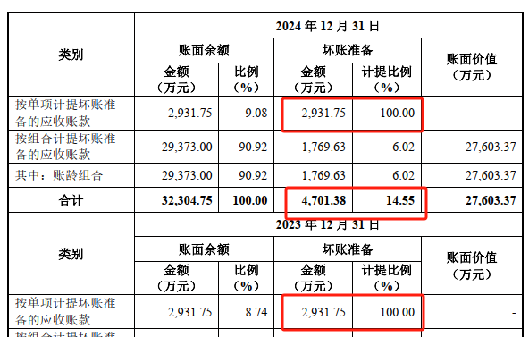 值得注意的是,目前标的公司的应收账款坏账准备综合计提比例仍远远高于可比公司水平。截至2024年底,标的公司应收账款坏账准备计提比例高达14.55%,而可比公司同期计提比例的平均值仅为4.45%,其高出可比公司平均值水平超2倍。对此,上市公司表示,其主要系标的公司单项计提坏账准备的金额较大所导致。而该时点,标的公司按单项计提的应收账款则以百分之百的比例全部计提了坏账准备,其计提金额高达2,931.75万元,占公司整体4,701.38万元计提坏账准备的超六成之多,且该单项计提庞大规模坏账准备早在2023年期末就已经存在。而对于该单项应收账款坏账准备的形成原因,标的公司是否存在放宽信用政策来提升营业收入等问题还需要上市公司予以详细解释说明。