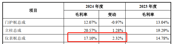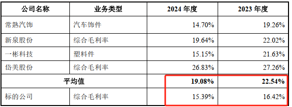 而从可比公司毛利率变动趋势来看,也与上述整车生产厂商成本控制力度正不断加大的趋势匹配度较高。重组报告书显示,2024年所选取可比公司相关业务的毛利率水平均出现了下滑,以仪表板总成产品为主的新泉股份为例,其汽车饰件业务的毛利率显著下滑至14.70%,较2023年大幅减少4.56%个百分点。但反观标的公司仪表板总成产品在营收规模同比还有所下滑的情况下,其同期的毛利率却出现了不降反升至17.10%,较2023年增长2.32个百分点。而这不但与下游整车制造厂商迫切的降本需求显然难以逻辑自洽,也与可比公司毛利率的显著降低形成了极为鲜明的对比。