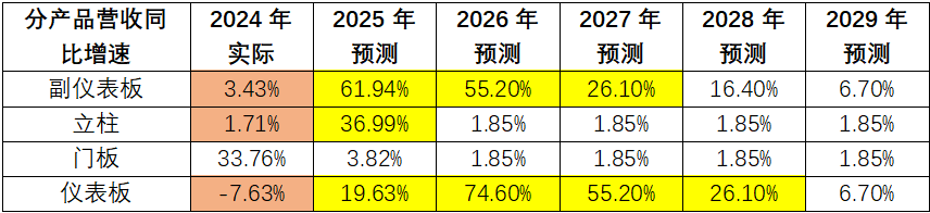 就具体分产品预测来看,评估机构所预计标的公司未来的营收增量主要由副仪表板、立柱、仪表板等三类产品贡献。其中,2025年-2027年标的公司副仪表板产品的营收同比增速预计将分别高达61.94%、55.20%、26.10%。而反观标的公司2024年该产品营收的同比增速则仅有3.43%,且2025年1-2月该产品已实现收入约1,926.96万元,按时间进度大致折算其全年营收规模约为11,561.76万元,与17,150.00万元的预测数也相去甚远之下,评估机构所预计标的公司副仪表板产品营收预测期内持续高速增长的合理性可能较低。