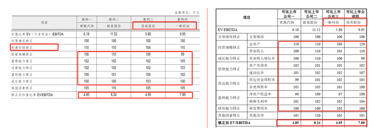 而市场法方面,资产评估报告中所披露价值比率测算表格还存在与重组报告书对应表格严重不一致的情况,也不得不令估值之家对于独立财务顾问、评估机构是否勤勉尽责与专业性,以及其测算结算的合理性颇为担忧。首先,在评估机构详细列示的修正比较因素中,我们并未查见其对发展阶段因素进行了修正,但在最终的EV/EBITDA价值比率测算表格中发展阶段修正因素却是赫然在列。其次,资产评估报告中经营规模、偿债能力、运营能力等数项修正指标测算数据也与重组报告书中对应数据并不匹配,但令人诧异的是两版修正后的EV/EBITDA数据却是完全一致。再次,更为离谱的是,即便两版修正后的EV/EBITDA数据完全一致,但所分别对应的可比公司却并不相同,资产评估报告岱美股份、一彬科技修正后的EV/EBITDA分别为4.95、7.89,而重组报告书中却是正好相反。