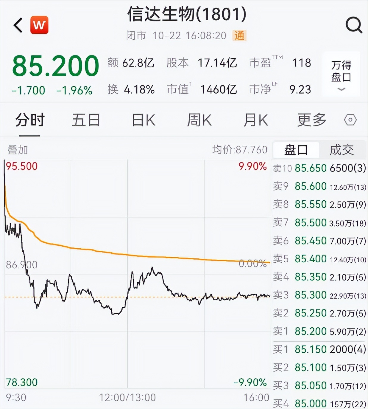 然而,重磅利好加持下,迎接投资者的却是令人难以置信的放量砸盘,10月22日信达生物以95.50港币/股开盘,高开9.90%,收盘下跌1.96%,全天最大回撤高达12.20%。