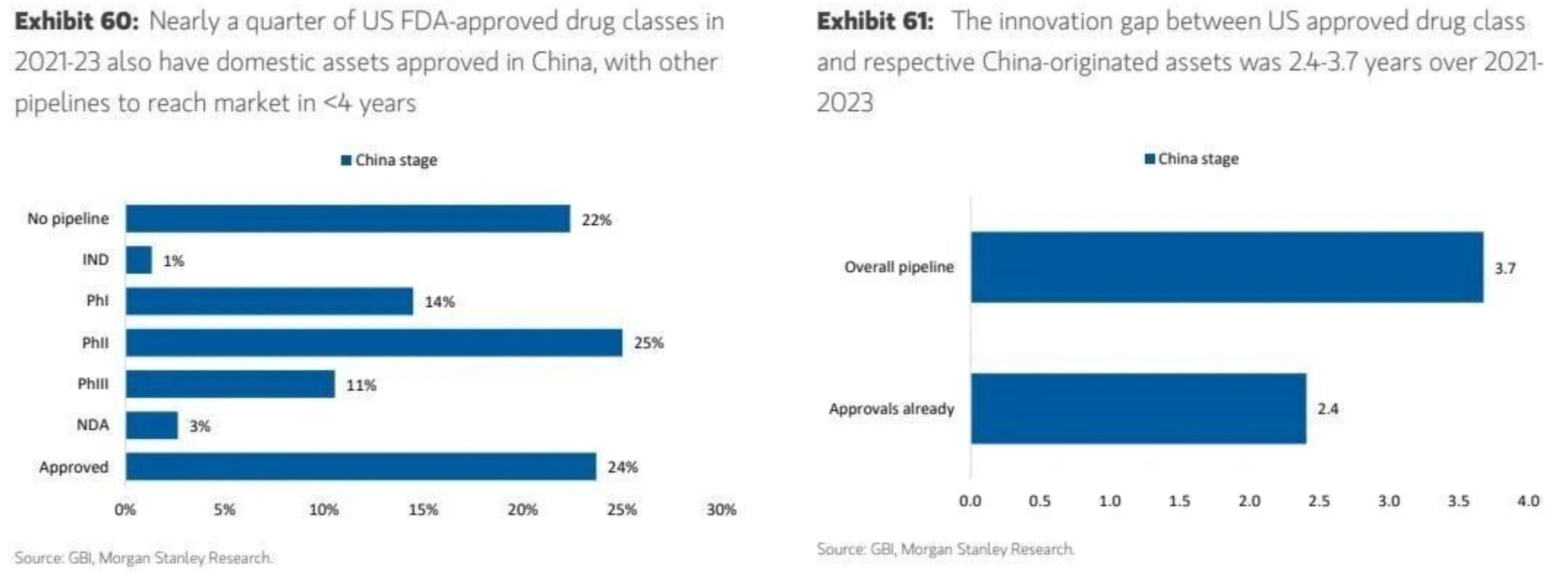 首先是供给端。简单来说,从纯粹的仿制药,到me too、me better等等,再到First in class,在工程师红利、极致效率叠加中国CXO产业优势下,中国创新药企业的进步速度非常快,模仿。据摩根士丹利分析,基于GBI管线数据库对比,2021~2023年中国原研资产与相应美国已批准药物类别的开发阶段,中国创新研发相对美国的差距已缩短至3.7年。这一差距在2005~2009年期间曾高达10年。