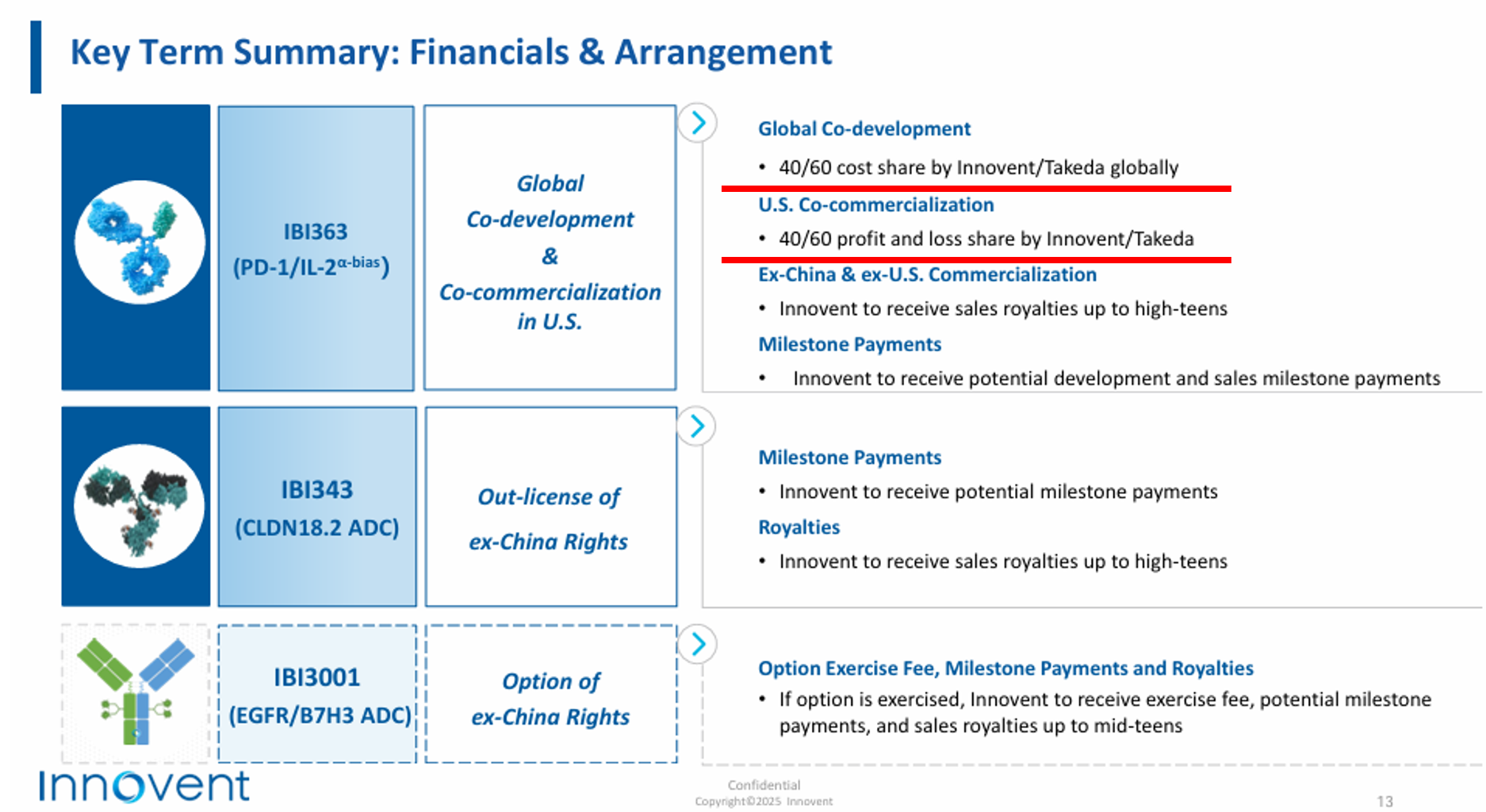 最值得关注的是,信达生物和武田制药对于IBI363的联合开发协议,双方将在全球范围内共同开发这一新一代IO基石疗法,并在美国共同商业化,信达生物、武田制药将按照40%、60%的比例分担开发成本和美国市场利润或损失。