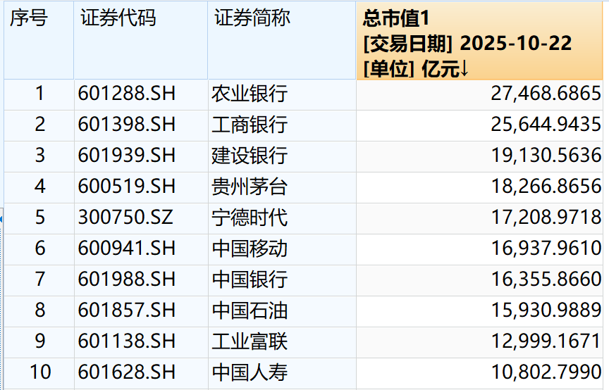 图片说明:截止到10月22日A股市值排名,数据来源于Wind