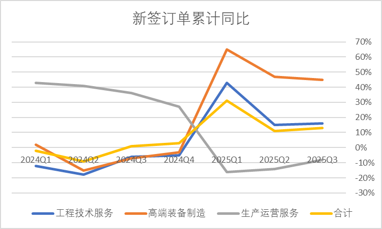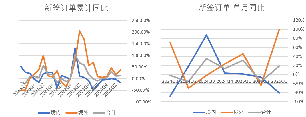 不过可喜的是,最新的经营数据已释放出积极信号。今年第三季度,公司新签订单与毛利率均呈现底部反转姿态。虽然境内新签订单仍下滑41%,但境外订单同比激增100%,推动总体新签订单增长19%。
