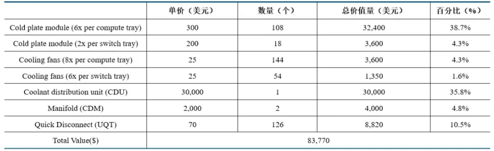 就价值量拆解来看,冷板式液冷产业链各环节的价值分布呈现着核心部件价值突出的结构性特征。中信建投数据显示,以GB200 NVL72机柜为例,其内部液冷系统的整体价值约为8.4万美元。而其中,芯片所对应冷板的合计价值量约为3.6万美元,占比达43%;冷却分配单元(CDU)价值量约为3万美元,占比达35.8%。