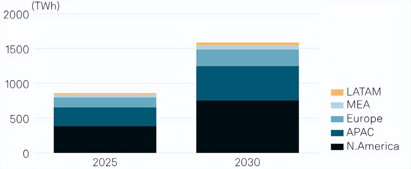 而算力飙升所推动的电力需求增长预计还将长期延续。451 Research数据显示,至2030年全球数据中心的总用电需求量预计将攀升至1,587TWh,较2025年的860 TWh几乎翻倍。