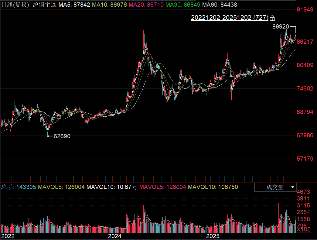 本周,全球铜市迎来标志性节点:伦敦金属交易所(LME)三个月期铜价格强势突破每吨11294.5美元,与此同时,上海期货交易所沪铜主力合约连续两日刷新纪录,最高触及每吨89920元。