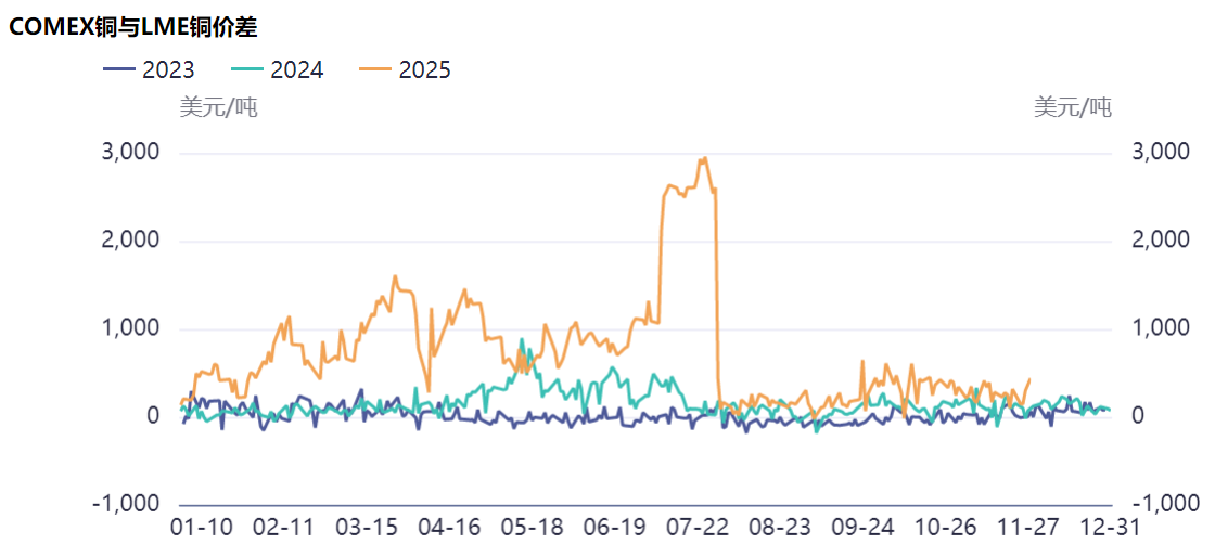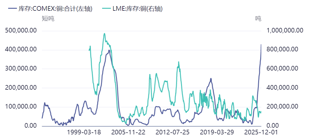 这种结构性价差引发了前所未有的库存地理迁移。交易商为捕捉套利机会而持续向美国发货,促使今年以来COMEX铜库存呈现高速增长曲线。截至12月1日,COMEX铜库存已经攀升至接近43万短吨,超过了2003年的历史峰值,达到了该交易所成立以来的最高水平。