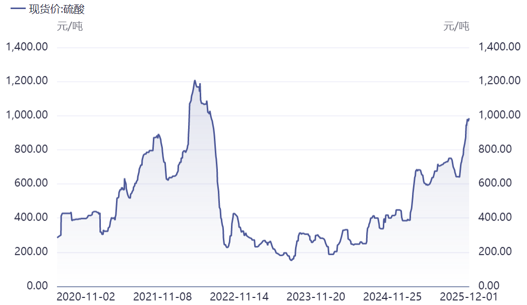 副产品硫酸成为了铜冶炼厂商的“现金流救生筏”。受上游成本上涨及下游磷肥、钛白粉等行业需求支撑,今年以来国内硫酸价格持续飙升,11月现货价同比涨幅超过120%。硫酸收入有效对冲了部分主产品加工的现金亏损。然而,这对于冶炼商来说仅能局部“止血”,而非“造血”的主业。