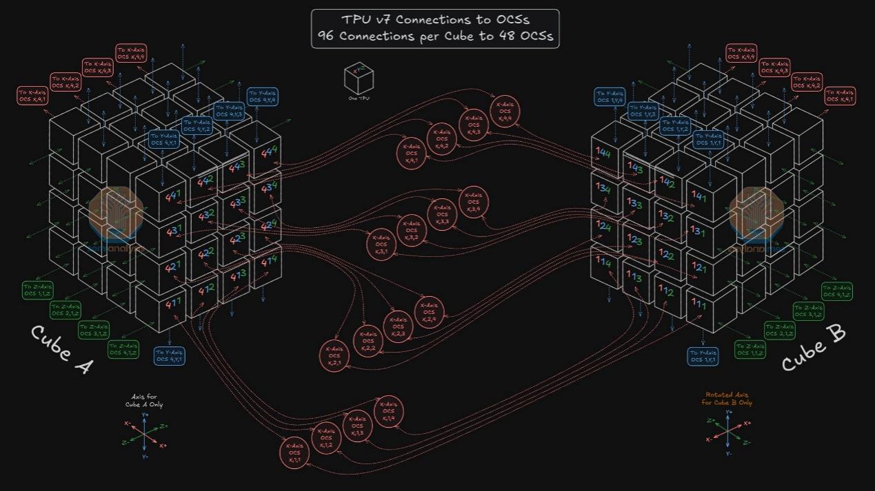 图片说明:一个典型的TPU机架互联示意图,数据来源于Semianalysis