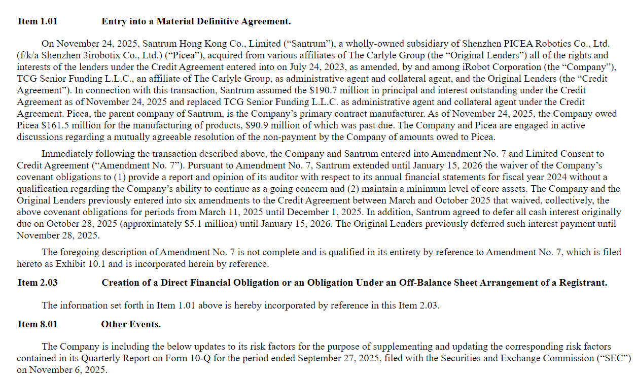 12月1日,昔日的行业开创者、美国iRobot公司在官网披露了一份文件。这份文件暴露出iRobot的严重债务问题,宣告了这家曾定义家用扫地机器人品类的公司,正徘徊在破产重组的边缘。