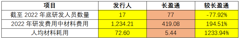 而从研发人员人均直接材料耗用情况来看,2022年发行人在期末仅有17名研发人员的情况下,便投入了高达1,234.21万元的直接材料用于研发。基于此进行测算,公司人均直接材料耗用高达72.60万元/人。而反观可比公司长盈通在同时点研发人员规模远超发行人3.5倍的情况下,其当年研发费用中的材料费仅有419.08万元,人均直接材料耗用仅为5.44万元/人。两者如此之大的差距之下,不得不令人合理怀疑发行人研发费用中极高的直接材料人均耗用水平是否符合行业惯例,公司对归属于研发费用直接材料的界定与核算是否准确。