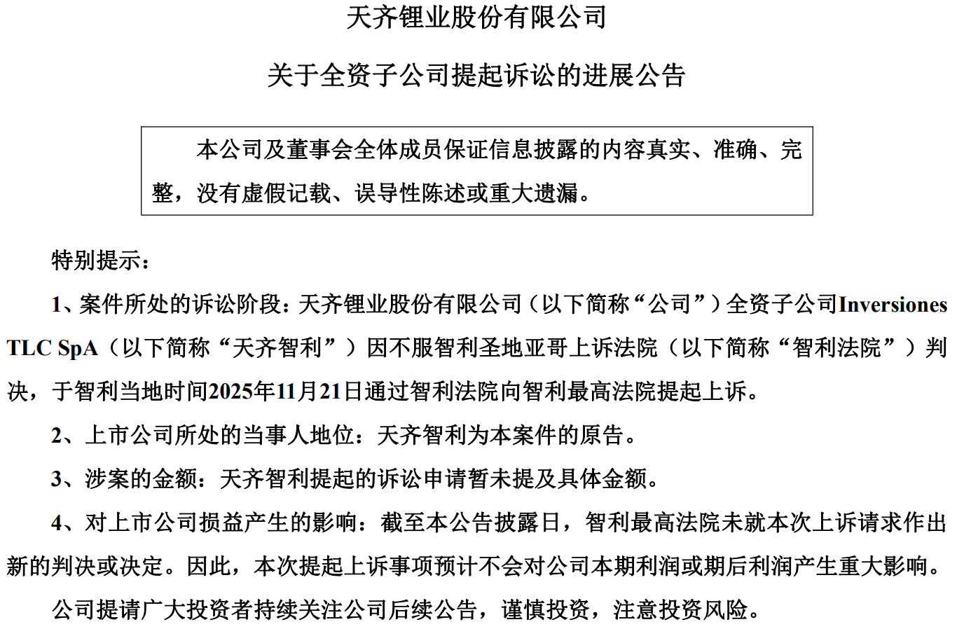 图片说明:天齐锂业近期就SQM与Codelco“公私合营”协议向智利最高法院提起上诉,数据来源于天齐锂业公告