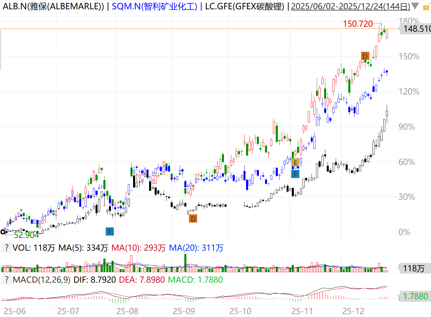 换个角度来看,无论是智利矿业化工、还是美国雅宝,两者的股价走势是高度趋同的,从下图中可以看到,可以认为两者的股价都是以广州期货交易所的碳酸锂期货价格为锚。总体来看,对于智利矿业化工和美国雅宝的股价走势,可以用一个词来形容:流畅,且股价涨幅均远大于期货涨幅。