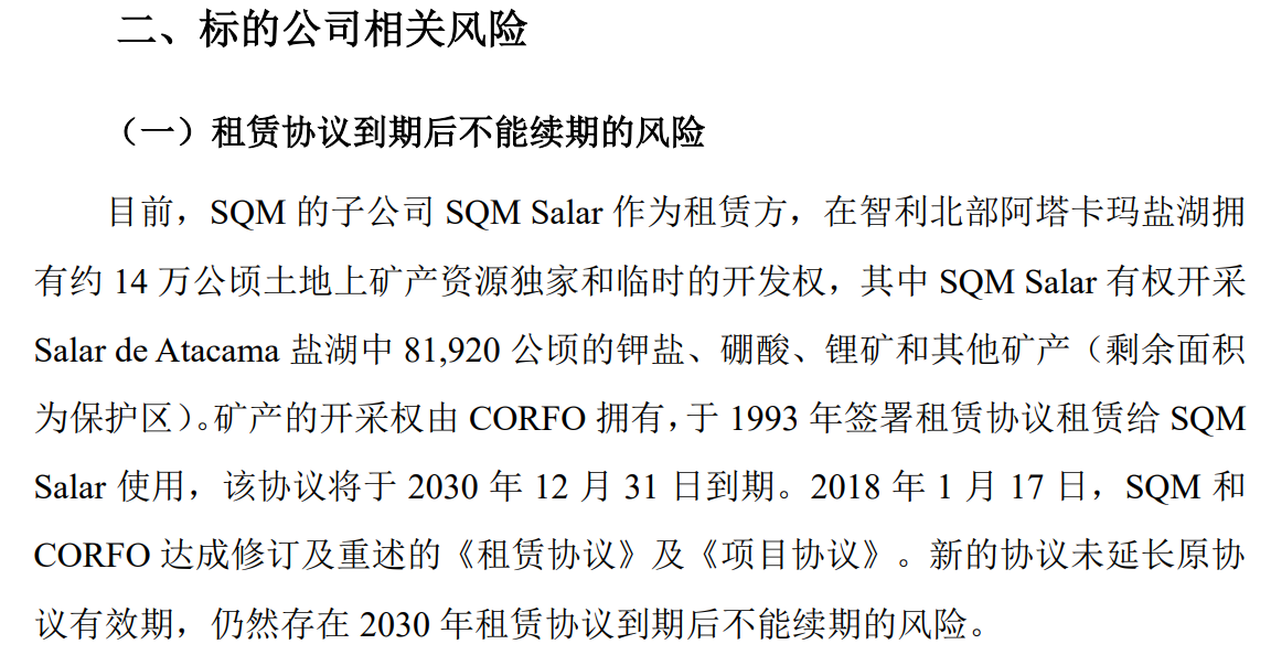 然而,“公私合营”这件事,虽然被频繁提及,但毕竟已经是两年以前的事情,市场对于天齐锂业权益上的潜在损失应当早已计价,况且2018年天齐锂业在《重大资产购买报告书(草案)(修订稿)》中的风险提示中,已经明确了阿塔卡马盐湖的开采权将于2030年12月31日到期,存在2030年到期后不能续期的风险。