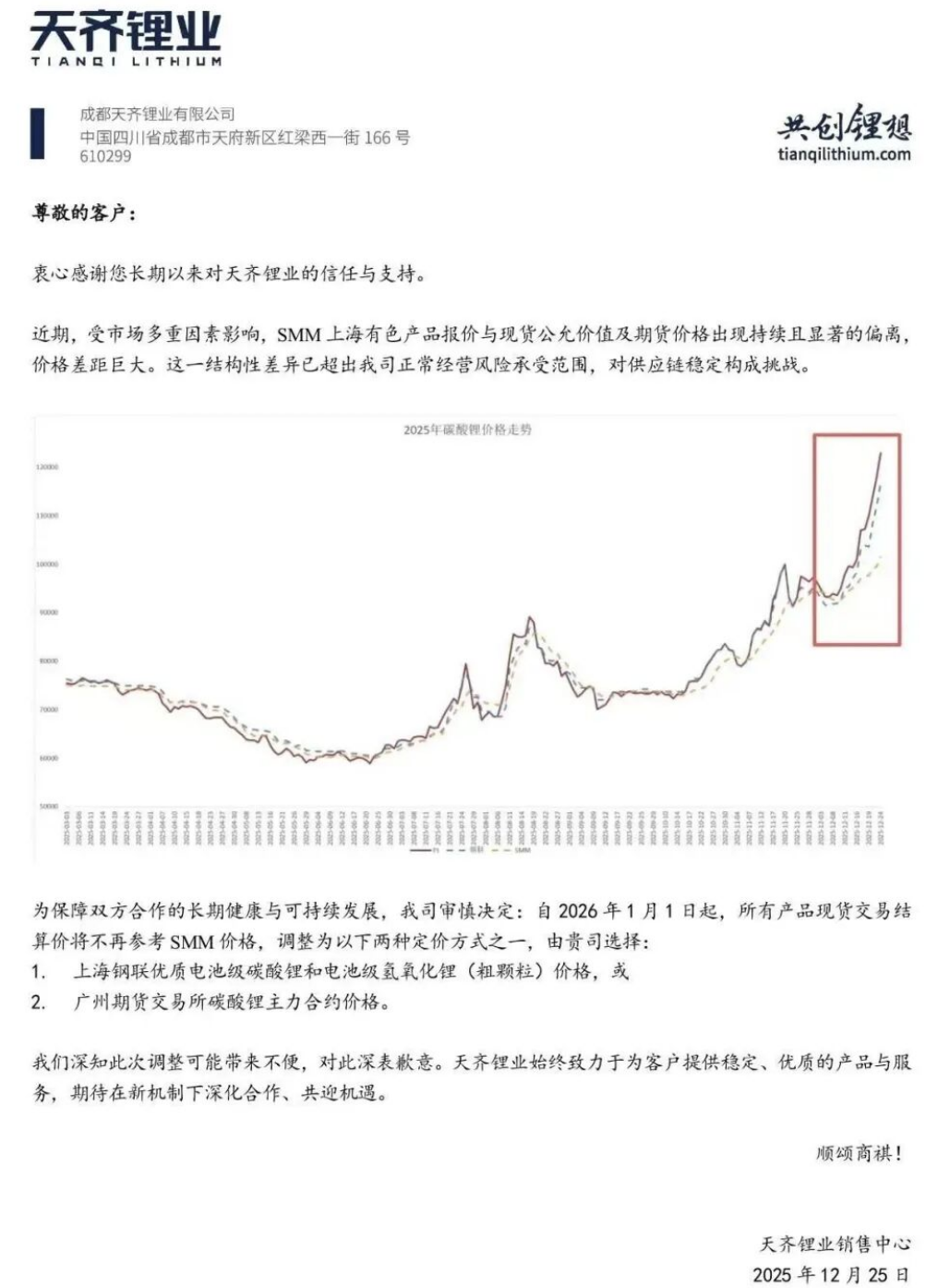 更有意思的是,12月25日,市场流传着一份由天齐锂业销售中心发布的关于调整碳酸锂结算价的通知,核心意思是SMM(上海有色网)的报价与现实脱节,天齐锂业自2026年1月1日起销售碳酸锂的时候将不再参考SMM的价格,而是调整为参考Mysteel(上海钢联)的电池级锂盐价格,或者参考广期所的碳酸锂期货主力合约价格。并且,21世纪经济报道记者从天齐锂业人士处核实了上述定价调整文件的真实性。