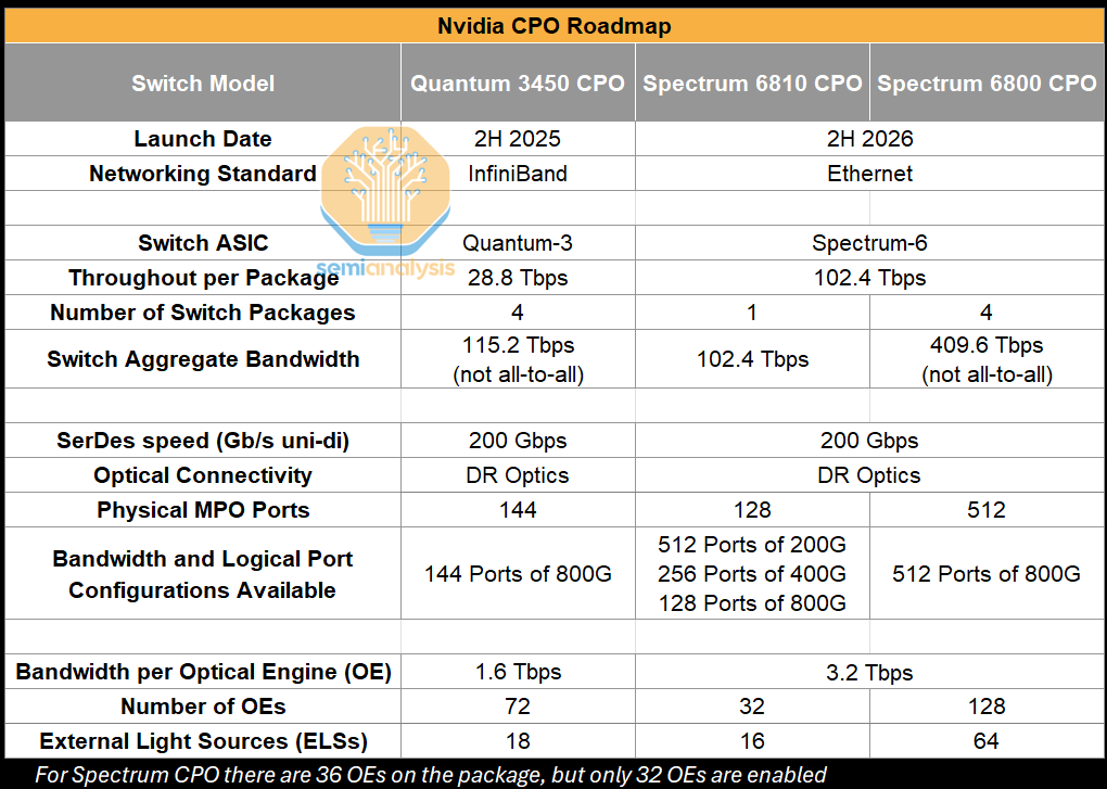 图片说明:英伟达CPO方案的硬件参数,数据来源于SemiAnalysis