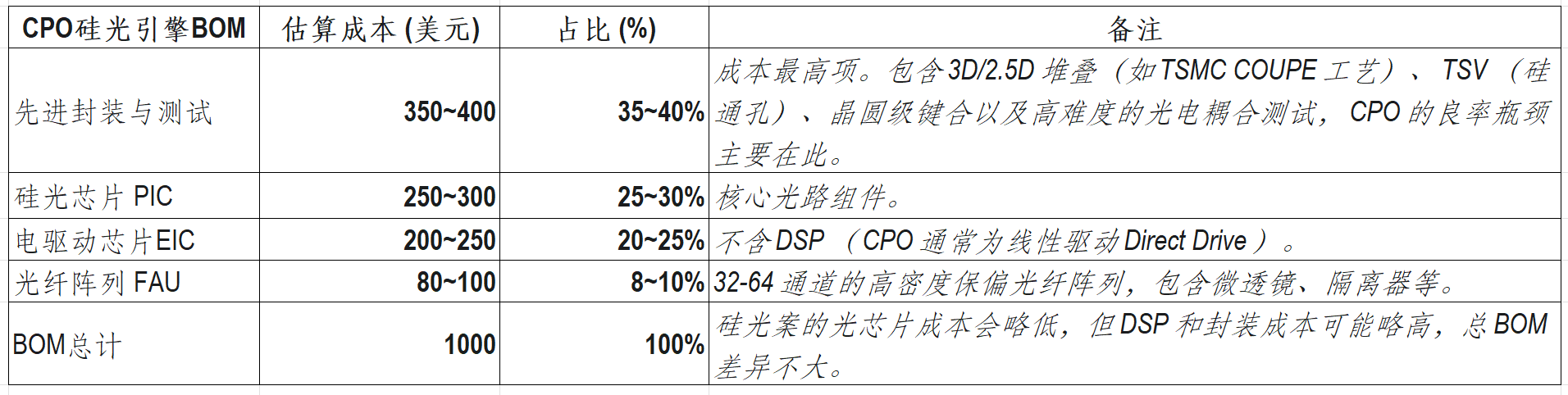 与可插拔光模块不同,CPO去掉了昂贵的DSP电芯片(或将其功能集成至交换ASIC芯片中),并将硅光引擎封装在交换ASIC芯片旁边,这使得硅光引擎封装取代了DSP电芯片成为了最大的成本中心,而硅光引擎封装正好是天孚通信所擅长的。