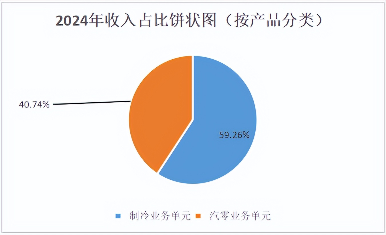 根据三花智控2024年年度报告数据,按产品分类:制冷业务单元销售收入165.61亿元,收入占比59.26%;汽零业务单元销售收入113.87亿元,收入占比40.74%。