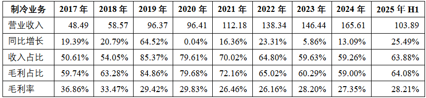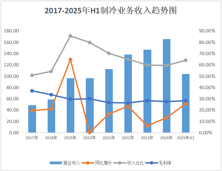 从2017年到2024年,公司制冷业务收入从48.49亿元增长2.42倍至165.61亿元,CAGR为19.18%,各年份均为增长。从目前的收入占比来看,制冷业务依然是公司的第一大业务,占比50%以上。从毛利占比来看,制冷业务占比达到60%及以上的水平。从毛利率来看,制冷业务的毛利率多年来保持在较为稳定的水平。2025年上半年,公司在制冷业务的表现也依然是向上增长。详见下表、图。