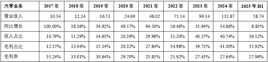 从2017年到2024年,公司汽零业务收入从10.34亿元增长10.01倍至113.87亿元,CAGR为40.88%,各年份均为增长。从目前的收入占比来看,汽零业务依然是公司的第二大业务,虽占比不及制冷业务,但它的平均增长速度较快。从毛利占比来看,它已显然成为成熟的第二增长曲线。和制冷业务相似,汽零业务毛利率也是多年保持在较为稳定的水平。2025年上半年,公司在汽零业务的表现也依然是向上增长。详见下表、图。