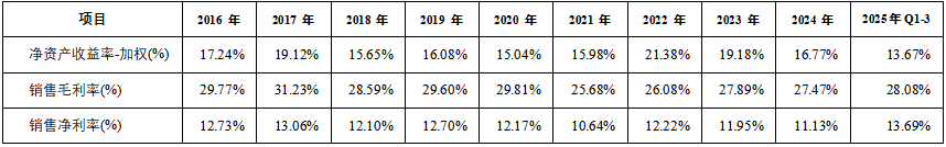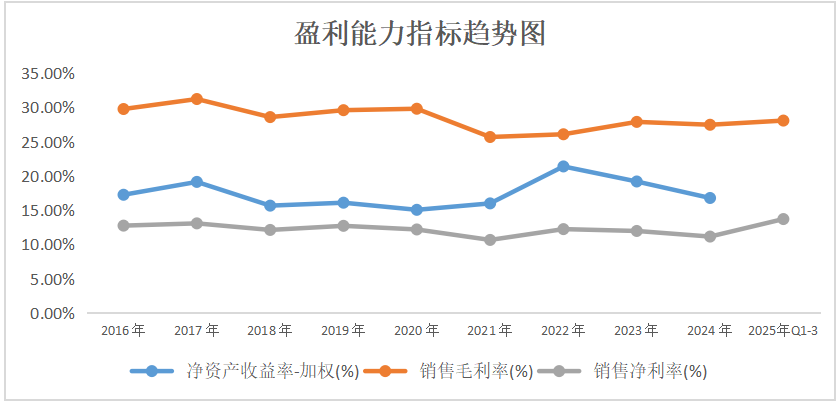 盈利能力方面:从2016年到2024年,三花智控的ROE(加权)在13.67%~21.38%间。公司近三年的ROE分别为21.38%、19.18%和16.77%。从2016年到2025年Q1-3,三花智控的销售毛利率在25.68% ~31.23%,近三年一期毛利率分别为26.08%、27.89%、27.47%和28.08%。