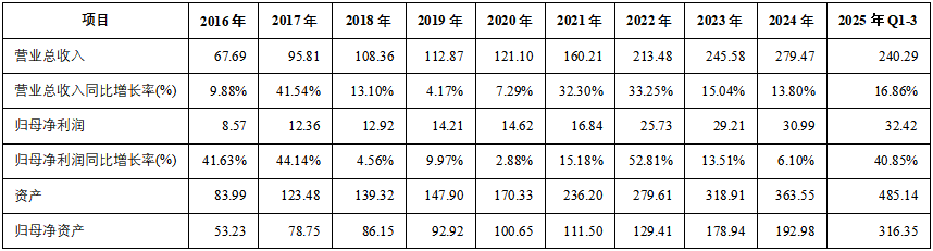 从2016年到2025年Q3,三花智控资产总额从83.99亿元增长4.78倍至485.14亿元;归母净资产从53.23亿元增长4.94倍至316.35亿元。
