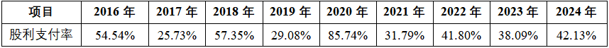 股利支付率:公司2016年~2024年的股利支付率为25.73%~85.74%。公司的分红策略兼顾股东利益和公司长期战略布局。