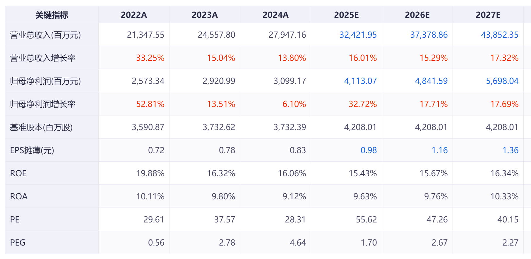 根据机构一致性预测,2025~2027年的营业收入分别为324.21亿元、373.78亿元和438.52亿元,归母净利润分别为41.13亿元、48.42亿元和56.98亿元,PE分别为55.62、47.26和40.15。机构预测其未来几年营业收入和归母净利润依然会保持持续增长。