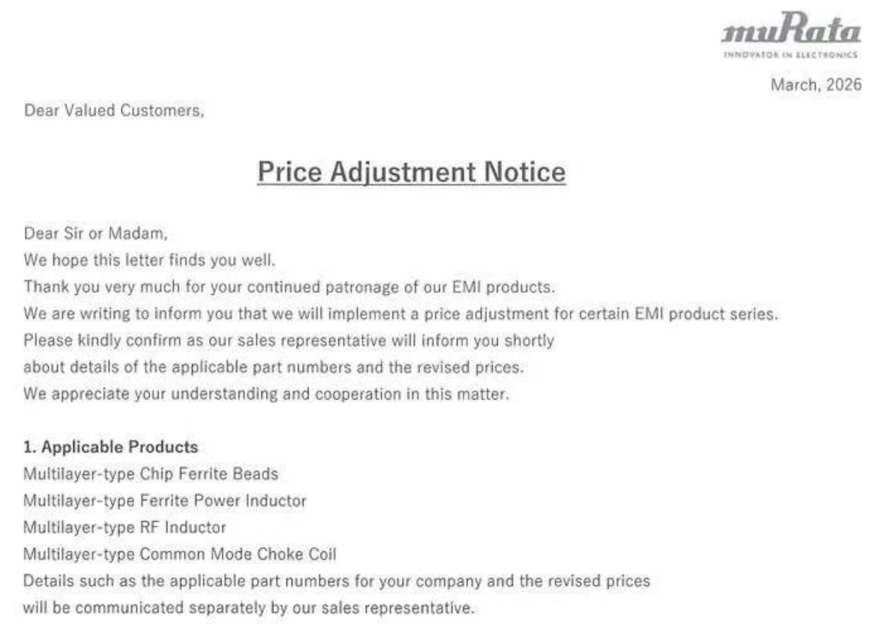 根据TrendForce 3月17日新闻,据中国台湾《自由时报》援引公司客户通知,日本村田制作所已正式宣布将在四个产品类别中调整价格,涵盖叠层片式铁氧体磁珠、叠层铁氧体功率电感、叠层射频电感及叠层共模扼流线圈,预计将于2026年4月1日生效。(该消息来源的涨价函中,涨价品类仅限于电感,不包括电容)