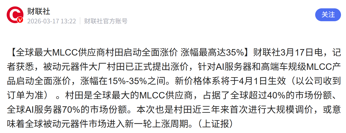 此外,同样是3月17日,根据财联社援引上海证券报的消息,村田制作所将对电容进行涨价。村田制作所将针对AI服务器和高端车规级MLCC(多层陶瓷电容器)产品启动全面涨价,涨幅幅度在15%~35%之间,是村田制作所近三年来首次进行大规模调价,新价格体系同样将于4月1日生效。