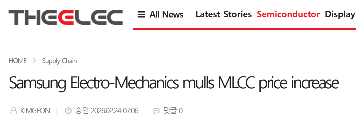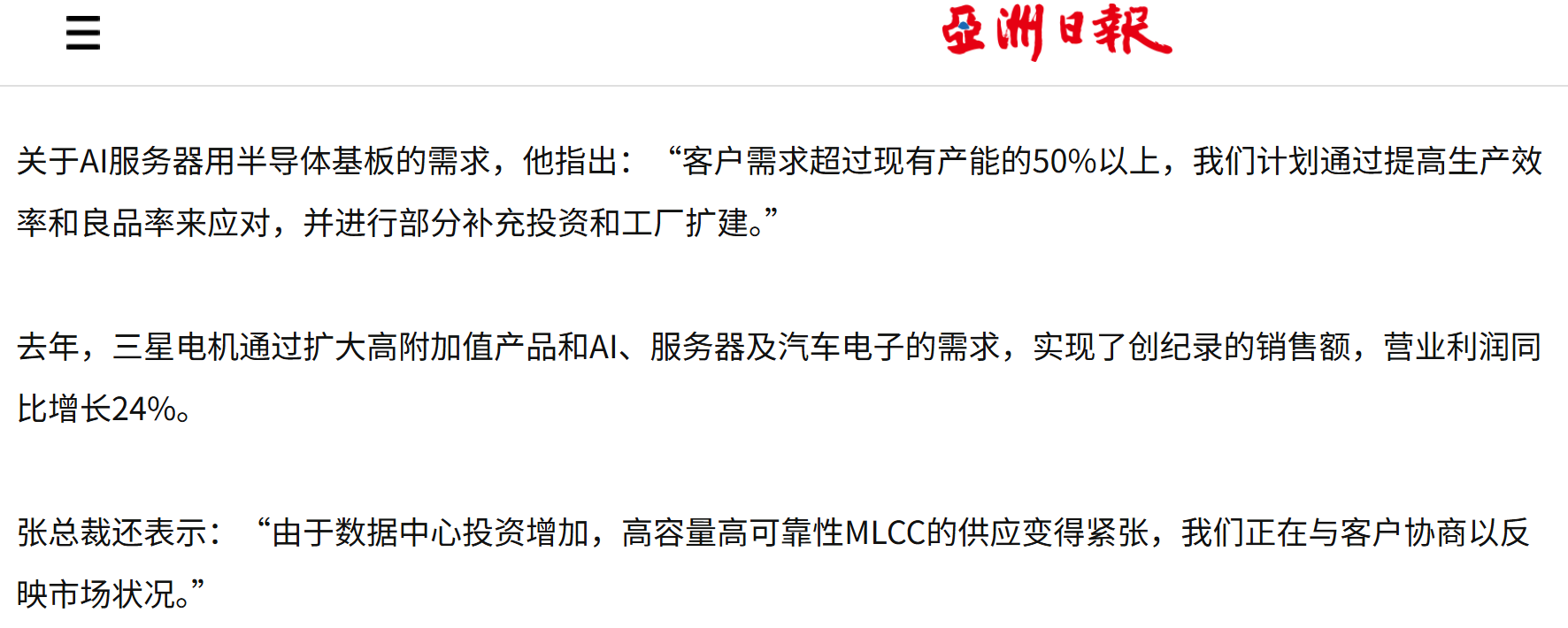 首先是春节期间,作为全球被动元器件龙头的村田制作所在接受彭博社采访时表示,AI客户对于公司高端MLCC的需求量是公司现有产能的两倍,因此村田制作所已启动内部讨论,讨论提高其高端MLCC的价格,并希望在三月底前做出决定。此外,据韩国媒体The Elec获悉,由于AI服务器对于MLCC的需求非常强劲,三星电机正计划追随村田制作所的脚步,考虑提高MLCC的价格。