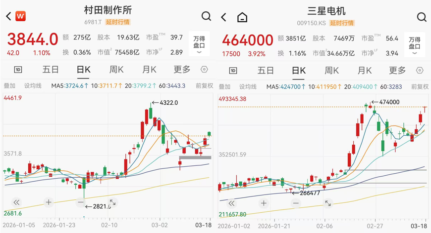 第二,产业趋势一旦确认,很难发生变化,风险偏好下行和流动性偏弱都是短暂因素。如3月18日三星电机召开第53届股东大会,明确三星电机的业务重心将全面转向AI服务器、汽车电子和人形机器人,同时明确表示高端MLCC供应紧张,正与客户协商意图涨价。