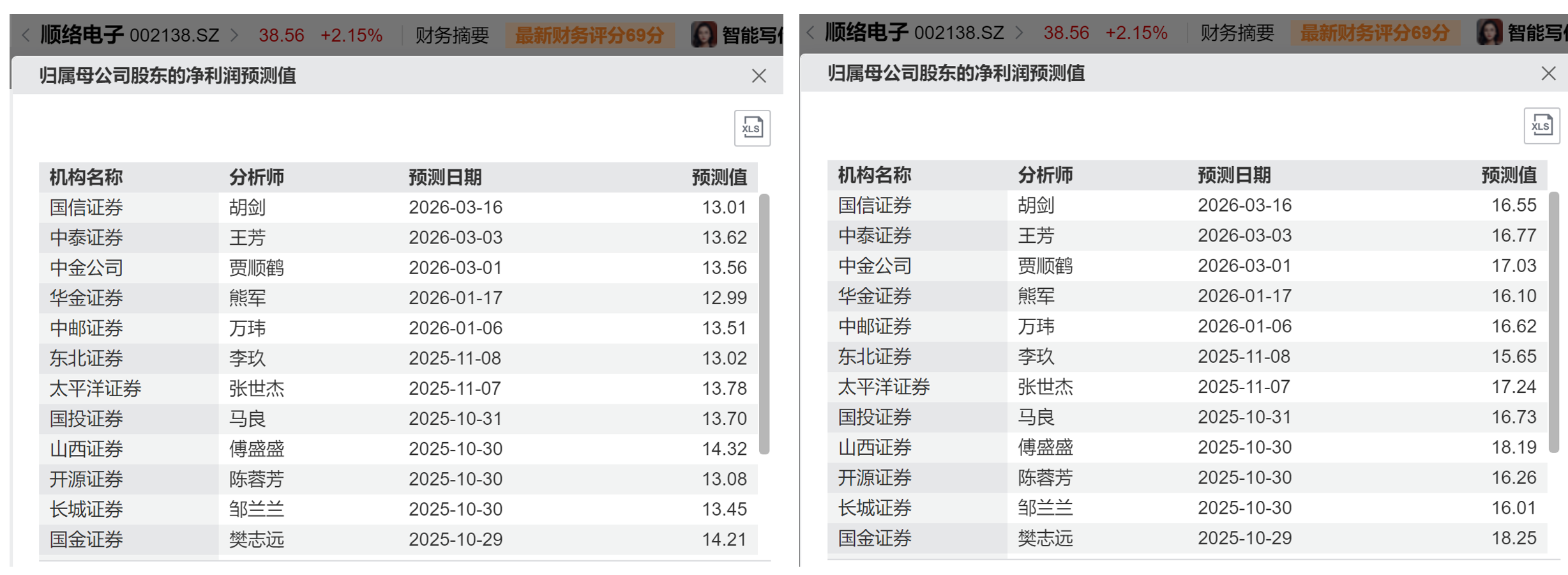 图片说明:不同券商对于顺络电子2026和2027年的业绩预测,数据来源于Wind
