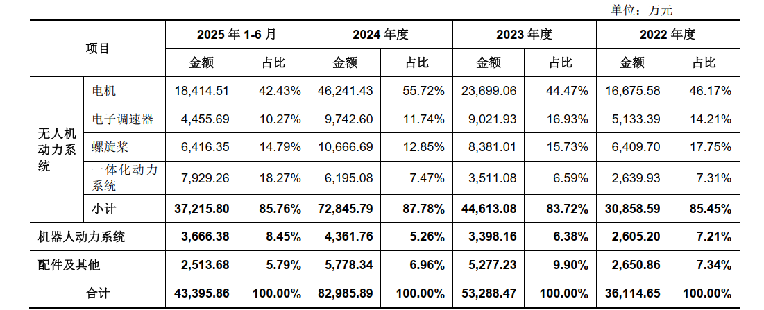 进一步来看,公司主要产品为无人机电动动力系统产品(电机、电子调速器、螺旋桨和一体化动力系统)和机器人动力系统产品(电机、模组)。2022年至2024年、2025年上半年,上述主要产品实现收入分别为3.35亿元、4.80亿元、7.72亿元和4.09亿元,在主营业务收入中占比保持在90%以上。